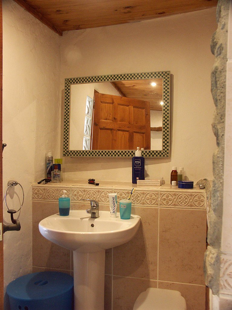 – de badkamer met wastafel, bad en toilet